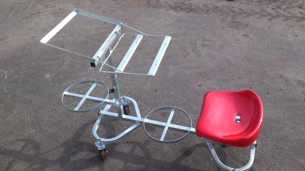 - Wózek jezdny z siedziskiem – wykonany z profili zamkniętych, wózek posiada miejsce na wiadro oraz wagę i koszyk. Dodatkowym ułatwieniem jest regulowane siedzisko oraz podstawka pod wagę i koszyk.