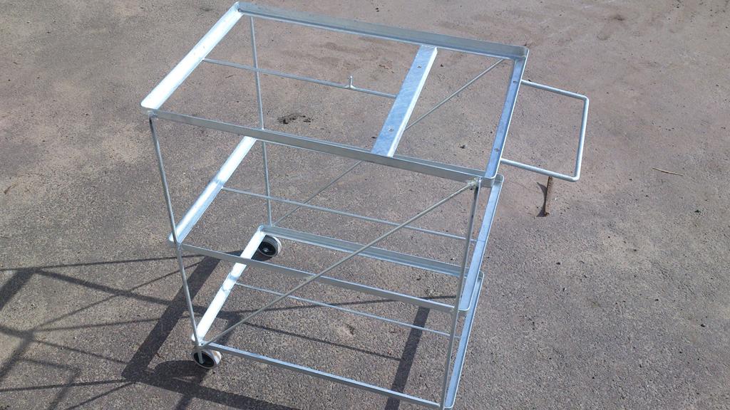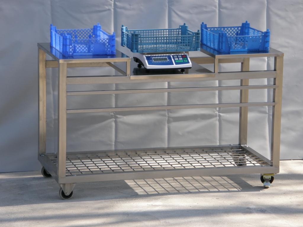 • Wózek do sortowania i ważenia pieczarek – konstrukcja takowego wózka została wykonana z profila zamkniętego ze stali kwasoodpornej. Na spodzie wózka zamocowano dodatkową siatkę zgrzewaną która służy jako półka.