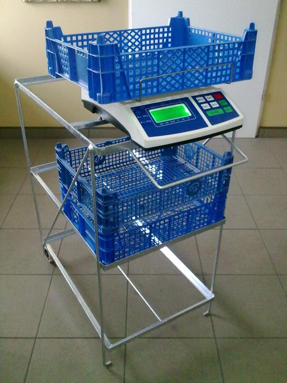 • Wózek do zbioru pieczarek z 1-ej oraz 2-ej półki - wykonany jest z wysoko gatunkowego pręta, który zapewnia dużą wytrzymałość, stabilność konstrukcji a zarazem jej lekkość. U góry wózka zamocowane są specjalne ramki w których to umieszcza się wagę oraz kosz.